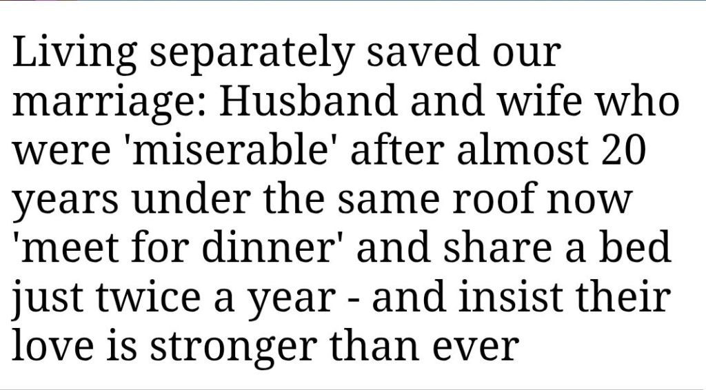 “The Dainters are one of a growing number of couples known as Living Apart Togethers (LATs). They are couples, often middle-aged but not always, who are fully committed to the vows they made on their wedding days, but who have no intention of cohabiting.”